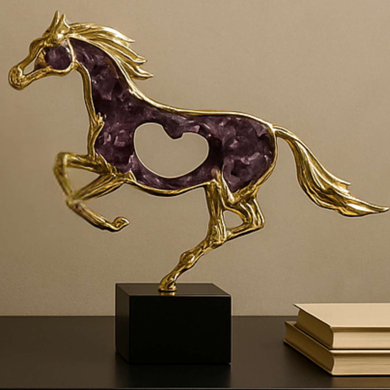 Its dynamic running silhouette, intricate detailing, and heart–shaped crystal core make this sculpture a striking centerpiece for any interior. Placed on premium black bases for added stability and elegance, these horses bring a touch of grandeur, symbolism, and refined opulence to modern spaces.